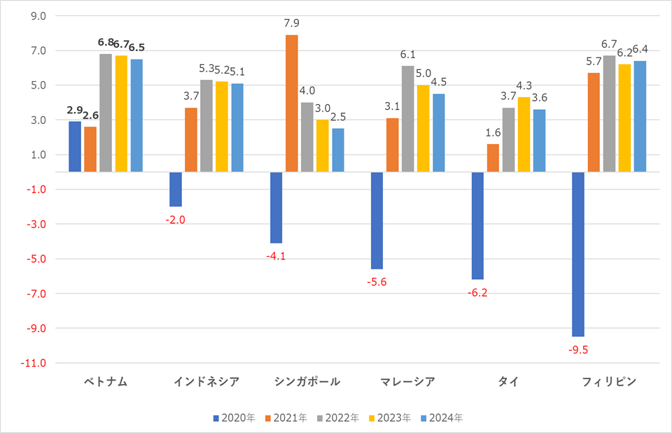 実際、コロナ禍で世界の経済は大きく落ち込みました。2020年はアジア各国の経済成長はマイナス成長となりましたが、ベトナム経済は落ち込んだもののマイナスには至っていません。