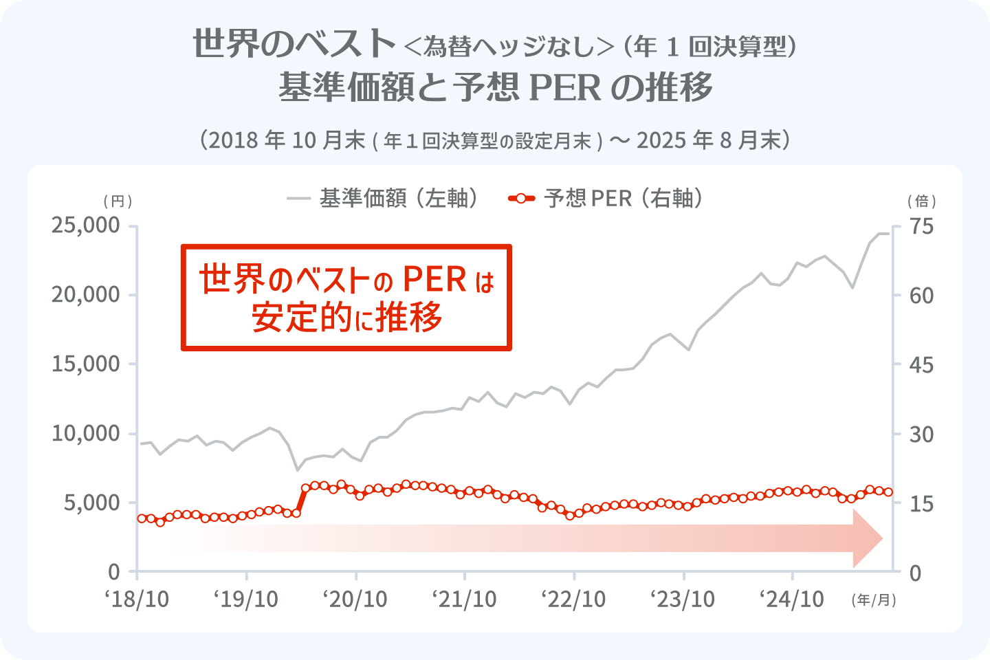 グラフ期間:2018年10月末(年1回決算型の設定月末)~2025年8月末。予想PERは12カ月先の予想1株当たり利益に基づく値を使用。「世界のベスト」の基準価額は(課税前分配金再投資、信託報酬控除後)を使用しています。上記は過去のデータであり、将来の成果を保証するものではありません。