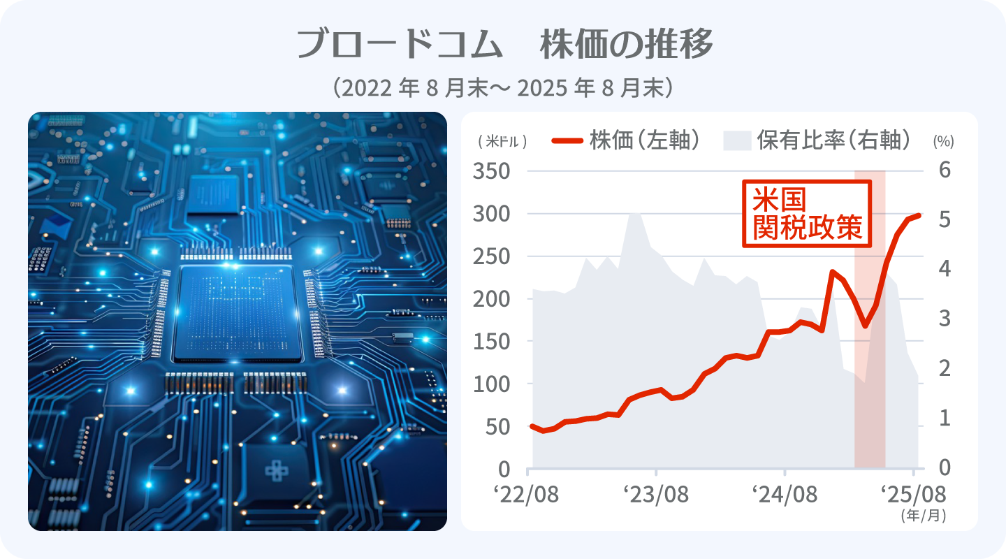 「世界のベスト」では以前よりブロードコムについて、業界内で強固な特許ポートフォリオを有する企業であり、特に通信向け半導体に強みを持つ点を評価し保有してきました。2025年4月に米国の関税政策への懸念から同社の株価が下落したタイミングでは、運用チームは同社の強固なポジションに変化はなく、引き続きソフトウェア事業などからの安定的な収益も見込まれるとの見通しのもと、株価の下落により割安になったと判断 し、追加で組み入れを行いました。