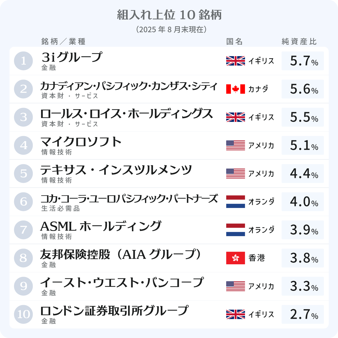 投資家の皆様があまり見慣れないという点では、組入トップの 3iグループ がその代表でしょう。
