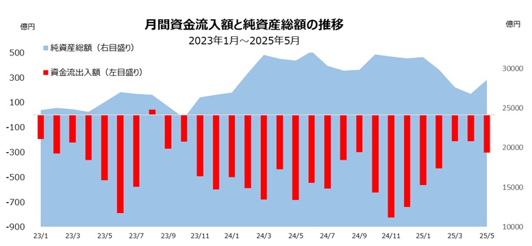 資金流出が続いていますが、基準価額の回復により純資産総額は、4か月ぶりに増加しました。
