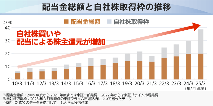 こうした一連の施策の結果、日本企業の意識が変化し、従来以上に資本効率を意識した経営が行われるようになり、自社株買いや配当による株主還元に積極的な企業が増えています。