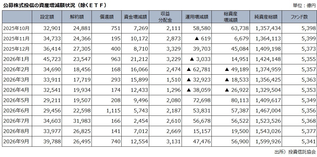 公募株式投信(ETF除く)の設定額から解約額と償還額を差し引いた資金増減額は、1兆2,554億円増となりました。
