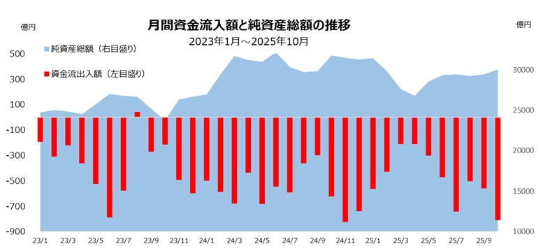 資金流出額は高水準でしたが、基準価額の上昇により純資産額合計は、3兆円台を回復しています。