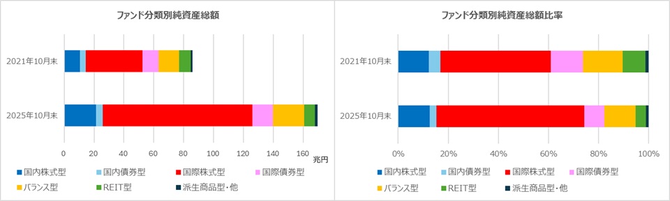 分類では、純資産総額が大幅に増加した国際株式型のみが、大きくシェアを伸ばしています。(右下グラフ)