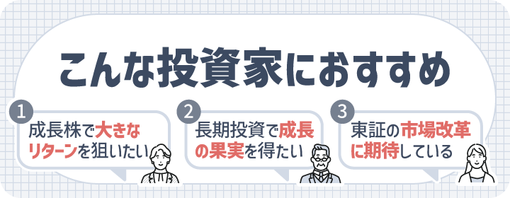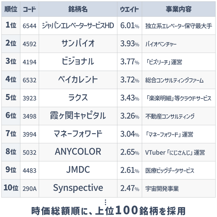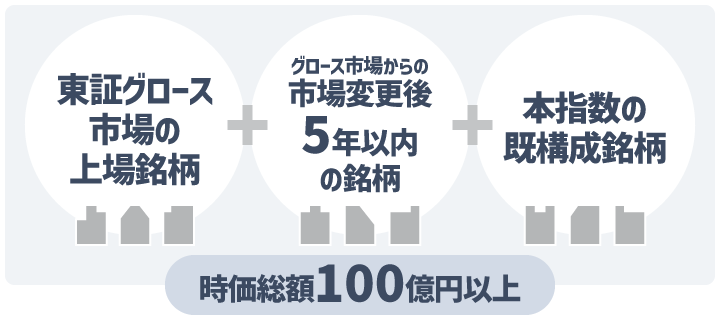 グロース市場の銘柄を中心に、成長性の高い企業に焦点を当てた構成です。なお、グロース市場からの市場変更後5年以内の銘柄や5年を超えていても高い成長を続ける銘柄も含みます。