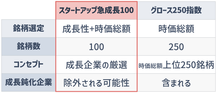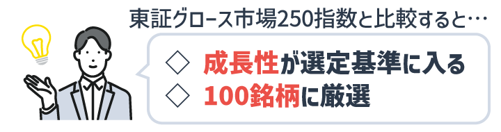 最大の違いは「成長性が選定基準に入っているかどうか」です。